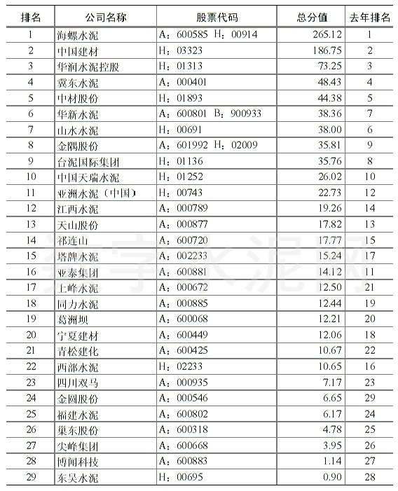5月7日,中國水泥協(xié)會公布2015年中國水泥上市公司綜合實力排名。海螺水泥、中國建材、華潤水泥控股依然位列前三甲,前十強還有:冀東水泥、中材股份、華新水泥、山水水泥、金隅股份、臺泥國際集團和中國天瑞水泥,亞泥(中國)緊隨其后,位列第11位。